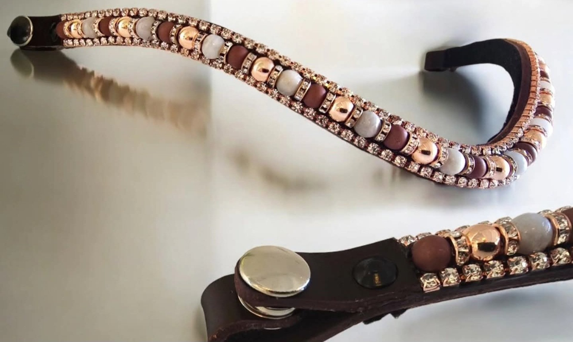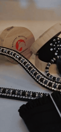 Frontriemen zijn er in talloze soorten, vormen en maten. Wat Moeders Mooiste Frontriemen bijzonder maakt, is het gebruik van kralen, rondelles en strass. Bovendien wordt elk stuk leer voor een frontriem en zadeljuweel met de hand gesneden. Elk product is met liefde en passie vervaardigd.